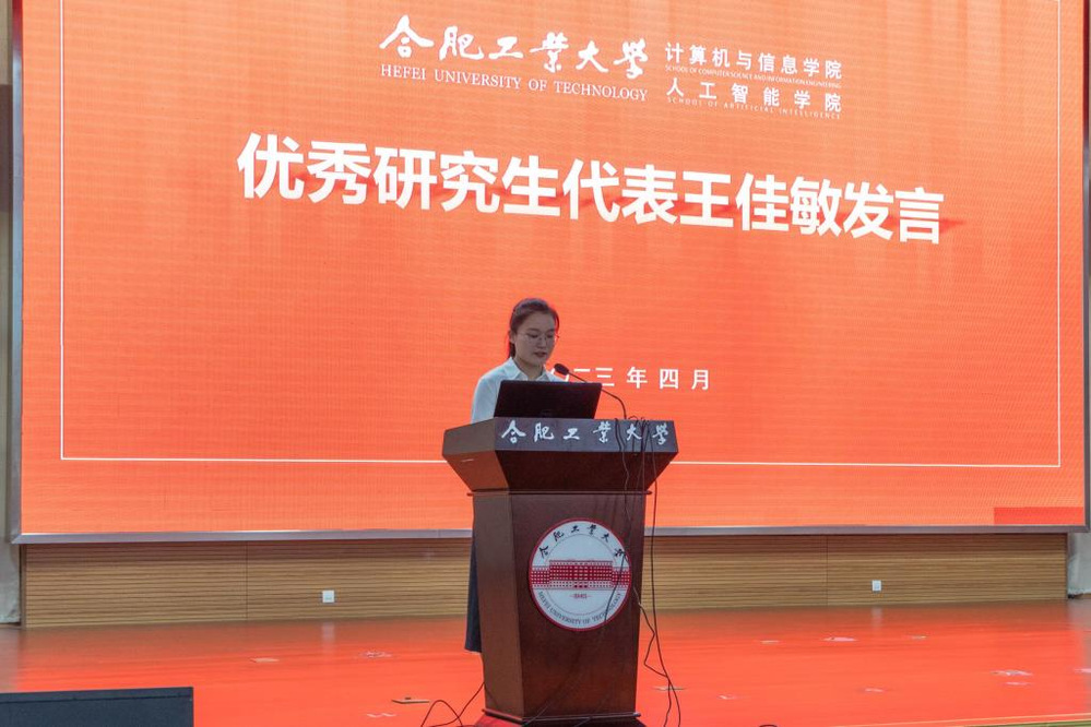正处级组织员郑荣美宣读了bat365官网登录入口2021-2022学年先进个人表彰决定。国家奖学金获得者、安徽省优秀毕业生、计算机科学与技术2020级硕士研究生王佳敏作为学生代表发言,她结合个人经历,号召同学们要以理想照亮前行的路,以奋斗书写青春答卷,以吃苦锤炼过硬本领,以担当彰显初心使命,做“眼中有光”、“脚下有路”、“手上有招”、“肩上有责”的新时代好青年。