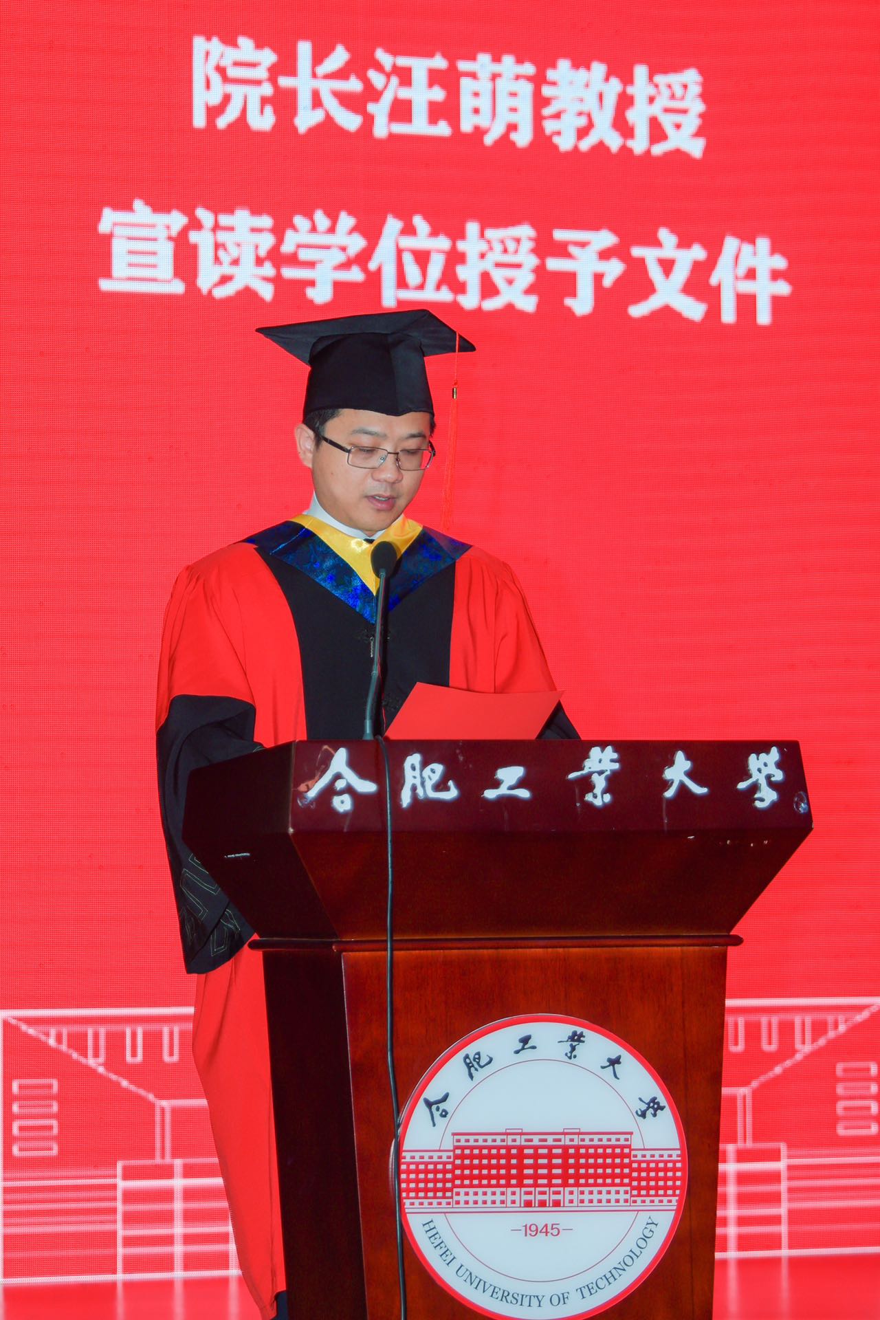 6月15日,bat365官网登录入口2023届毕业生学位授予仪式在翡翠湖校区科教楼二楼报告厅举行。合肥工业大学党委副书记陈刚、学院领导班子、学院学位评定委员会委员、教师代表以及2023届博士、硕士、学士学位获得者参加学位授予仪式。仪式由学院党委副书记兼纪委书记张海林主持。