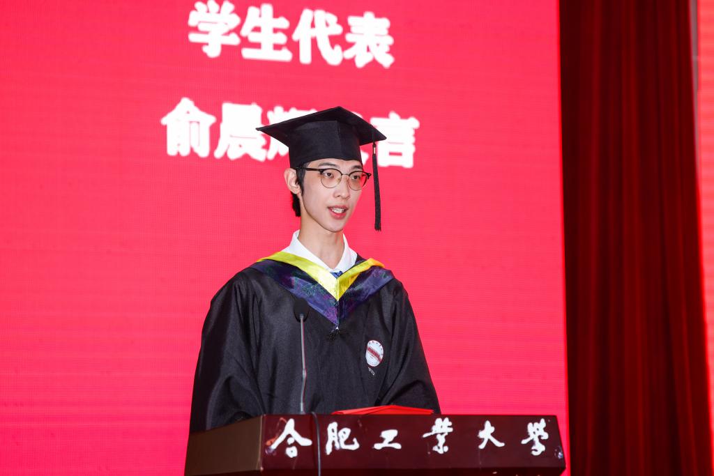 毕业生代表俞晨辉回顾了在工大求学的经历,分享了在“厚德、笃学、崇实、尚新”校训的影响下勇敢追梦以及受益于第二课堂成绩单制度勤于圆梦的青春故事。他代表毕业生向母校保证要牢记校训,追求卓越;爱校荣校,涵养情怀、奉献担当,拼搏创新。