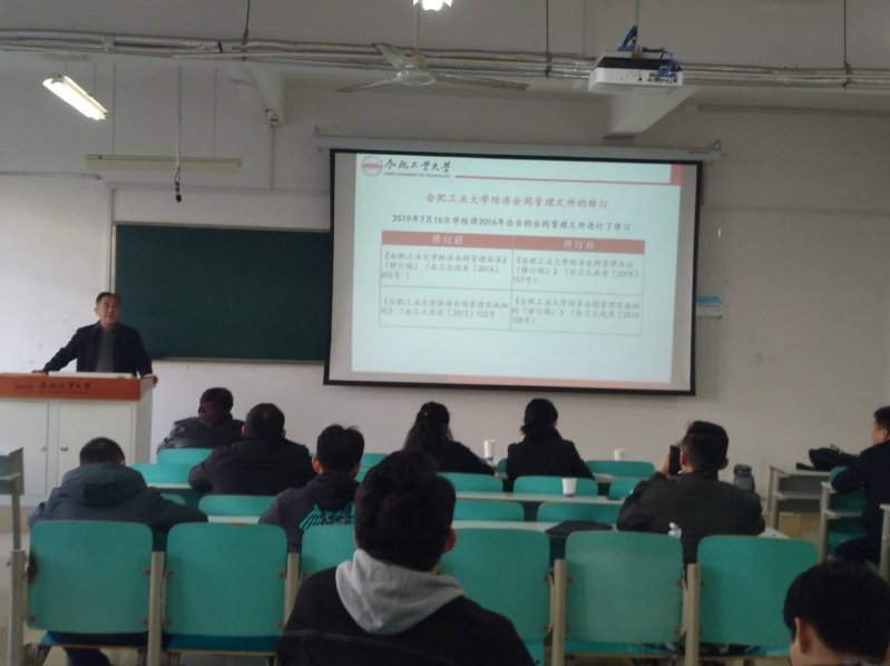 此次科研讲座分为三个内容,首先财务处时序民主任讲述了合肥工业大学经济合同管理相关政策以及如何起草、上传合同;紧接着招标与采购中心贾贤龙副主任详尽的解读了学校招标采购法律法规和操作实务;科研经费管理办公室张思琦老师重点讲述了2019年合肥工业大学科研经费使用指南——科研经费预算调整的简化,差旅费标准的变化,业务审核流程的前后对比,科研经费报销手续的简化等等,张思琦老师就科研经费的财务报账要求进行了梳理,满满的干货让在座的许多科研课题负责人和研究生充分了解了课题从申报到立项后的流程是什么,该怎么规范合理使用课题经费。大家纷纷表示有所获有所得。
