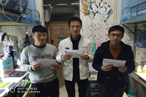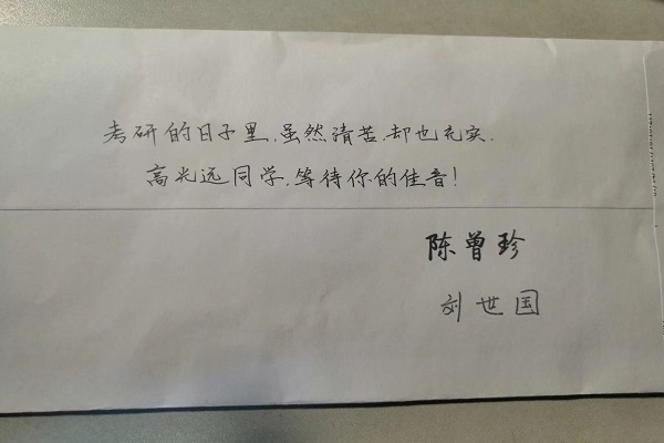 考虑到考研学子的学习时间,支部将此次活动定在了晚上,夜晚的凛冽寒风却不能抵挡支部党员们的热情,学生党员们前往每一个考研学子的宿舍,将支部精心制作的爱心信封分发给同学们,信封里除了考研所必需的水笔,2B铅笔,橡皮等文具之外,还有2015级辅导员陈曾珍、刘世国为同学们亲手写的祝福语。