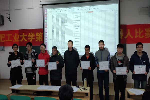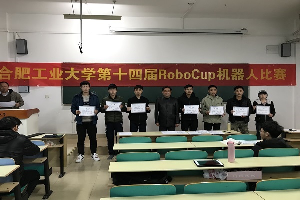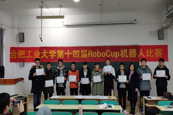 12月19日下午,合肥工业大学第十四届RoboCup机器人大赛决赛在翡翠湖校区10教201成功举行。教务处副处长、创新创业教育中心主任黄景荣,创新创业教育中心副主任徐慧,我院创新中心主任杨兴明、王浩教授和方宝富老师到场观摩指导比赛并参加了最后的颁奖仪式。