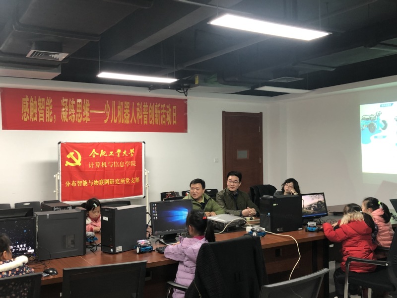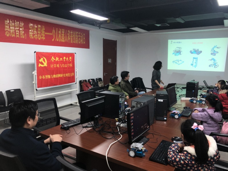 “创新培养,从孩子们做起!”在人工智能浪潮席卷全球的背景下,分布智能与物联网研究所党支部于2018年12月22日在翡翠湖校区翡翠科教楼A1602会议室,发挥专业特长,面向校内教师子女开展了一次以“感触智能,凝练思维”为主题的少儿机器人科普创新活动。